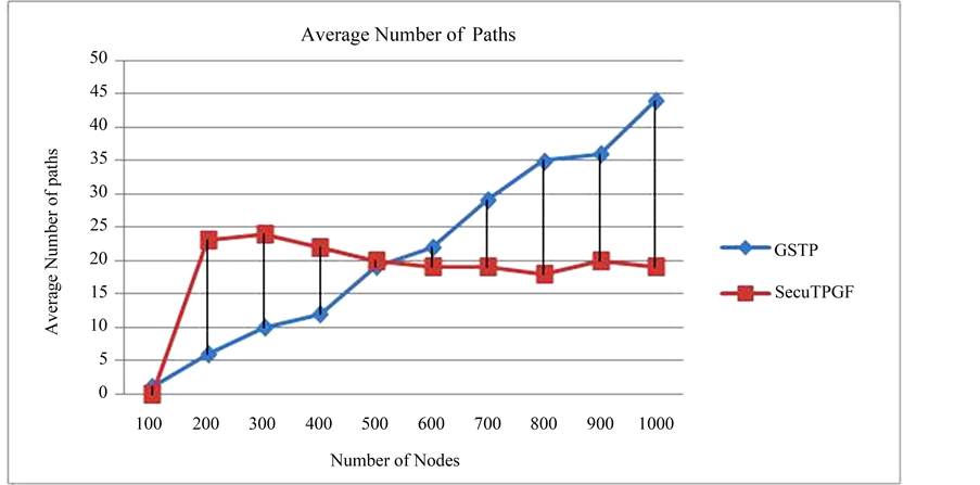 Figure 6 is the simulation results on average number of paths. Basically SecuTPGF is a multipath routing algorithm, Multipath routing refers to a routing strategy that finds more than one path to the destination according to certain constraints. These paths share the network load, aiming at routing efficiency. By comparing the results in the given figure, can easily see that GSTP routing can find much more number of paths than that of SecuTPGF when the number of nodes is more than 500 nodes.
