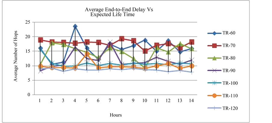 Figure 7 is the simulation results on average end-to-end delay over an expected life time. By comparing the results given in the figure, it is observed that there is a significant decrease in the average number of hops as the Transmission Radius is increased for a fixed number of nodes and area. Here the number of nodes taken for the simulation is 500 nodes and the transmission radius is varied from 60 to 120 m. When the transmission radius is 120 m, the number of hops used to transmit the data is reduced.