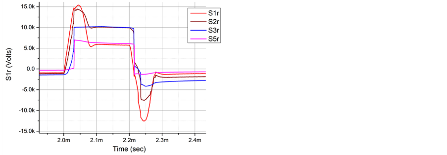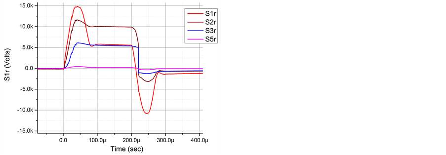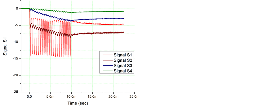 Figure 3. Surface charge sensors typical traces. S1-S4―sensor numbers from closest to exposed electrode to the furthest away. (a) Positive polarity; (b) Negative polarity.