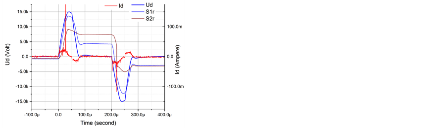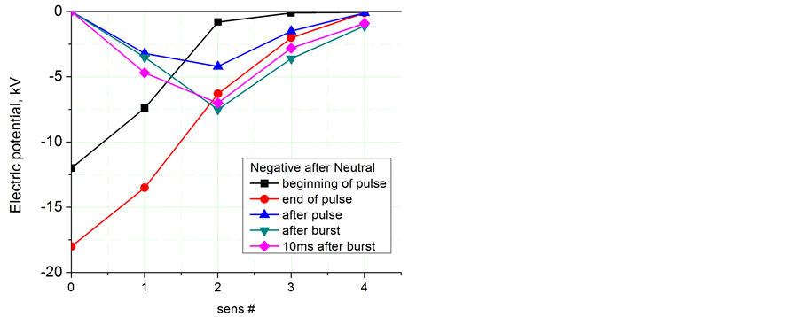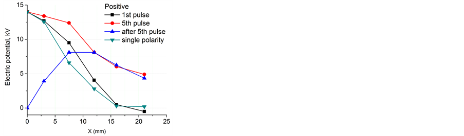 The dynamics of the surface potential distribution during an individual pulse and after it is presented in Figure 9. An initial distribution at t = 0 is established by the previous pulse of opposite polarity. Before the discharge contraction t < 40 µs the potential grows almost linearly in the area x < 16 mm. This pattern roughly corresponds to the semi-empirical phenomenological models considered in [22] [23]. Then, at t ≥ 40 µs, the process of the discharge contraction modifies the surface potential to have a more flatprofile. After the decrease of the HV electrode voltage, the surface potential distribution relaxes in the near-electrode zone but remains stable at x > 10 mm. The “flash” of the discharge contraction occurs at the time of maximal value of the electric field. The spatial resolution of the CSs does not allow a real value of the local electric field to be measured but does allow for an estimate of the lower limit of the electric field for the contraction development, Emax > 15 kV/cm. Based on the experimental data of this test series the contraction “flash” may be roughly characterized by the following parameters: duration of current peak t £ 100 ns, electric charge deposited 0.1 µC £ Q £ 1 µC, and electric current I ≥ 1 A.