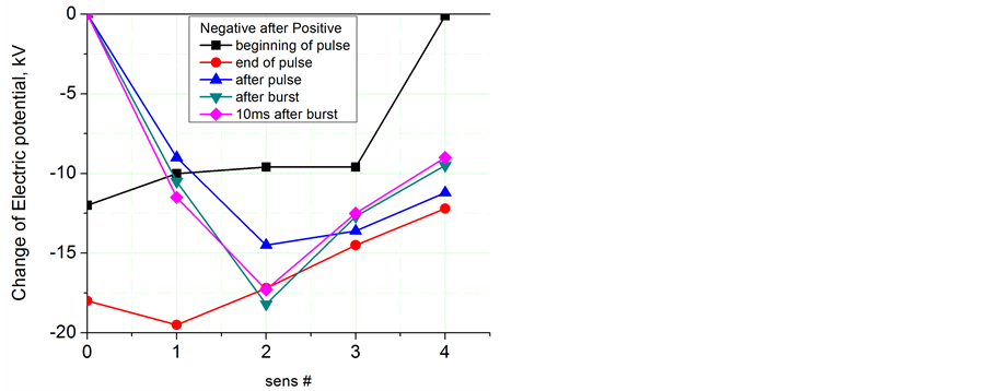 For the second experimental series with the alternating polarity of pulses the analysis of the charge deposition dynamics and distribution over the dielectric surface is fulfilled based on the data of the charge sensors. Figure 2(b) and Figure 6 presents the recalculated set of the oscilloscope records: the measured values are refined