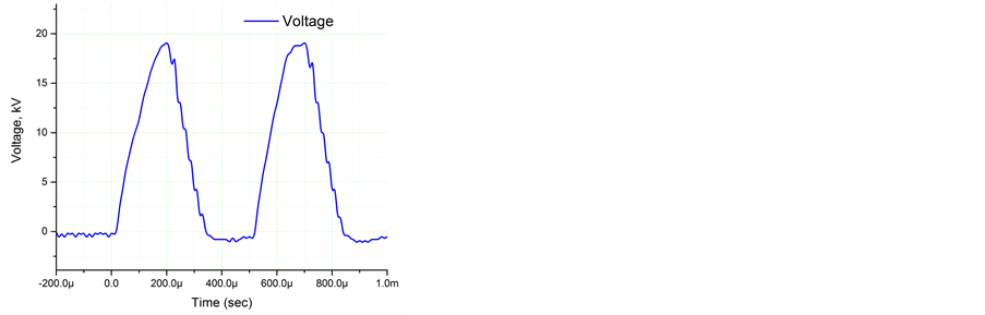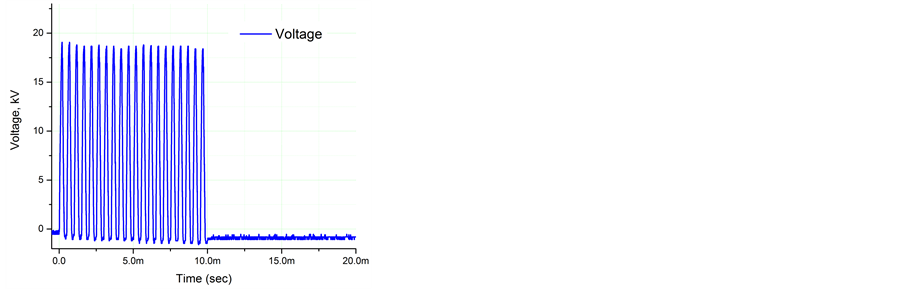 In the first experimental series (Section 3.1) the power supply (TREK 20/20C plus function generator) operates in burst mode as shown in Figure 2(a) similar for positive and negative polarity pulses. The voltage amplitude is U = 18 kV, duration of each pulse is t = 0.2 ms, repetition period T = 0.5 ms, and typical number of pulses is N = 20. Figure 2(a) right shows the waveform in a more detailed view indicating the rather long fronts of the voltage pulses dU/dt » 108 V/s.