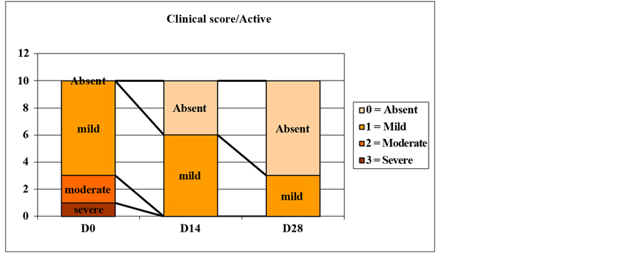 The clinical score showed a better efficiency of active compared with the excipient: a significant difference between D0 and D28 was only observed for the active ingredient.