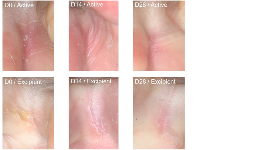 Only 3 volunteers did not heal within 28 days with the active product (versus 8 with excipient): 2 did not improve and there was an improvement from a “severe” stage (day 0) to a “mild” stage (day 28) for the 3rd one.