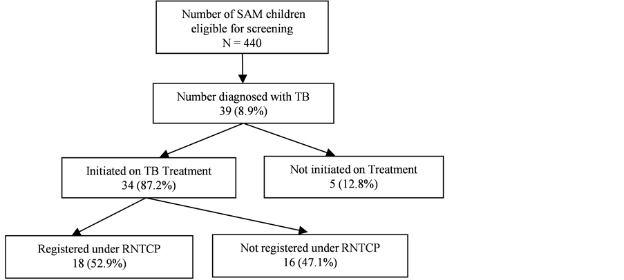 In response to an increased number of SAM children and malnutrition-related deaths in Bihar [12] , the Government of India’s National Rural Health Mission established Nutritional Rehabilitation Centres (NRCs) in 2011. NRC paediatricians clinically manage SAM children through therapeutic feeding and growth monitoring. They also provide immunizations, diagnose and treat infectious diseases, including TB. Historically, India’s Revised National Tuberculosis Control Programme (RNTCP) has primarily focused on adults, using sputum-smear microscopy for diagnosis, a tool that is not as effective for children with tuberculosis [13] [14] . In 2012, the RNTCP and Indian Academy of Pediatrics (IAP) developed a consensus statement for standardized diagnosis and management for childhood tuberculosis [15] [16] . The feasibility of applying the national diagnostic algorithm has not been fully evaluated among children with malnutrition. Intensified case finding at NRCs may provide an opportunity to identify and link children with TB to care. Thus, we sought to determine the proportion of TB cases detected among the eligible SAM children screened according to the national diagnostic algorithm at NRCs and documented the proportion that was registered with the RNTCP for TB treatment and care.