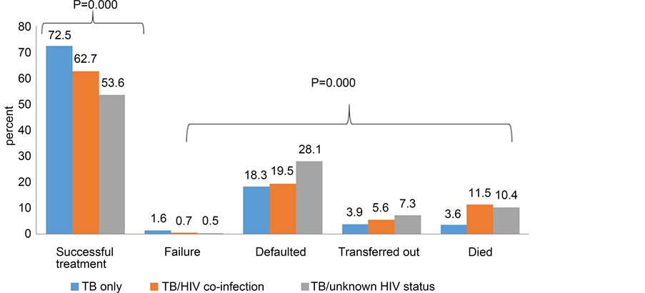 Figure 1. Percentage treatment outcome of TB patients by HIV status.