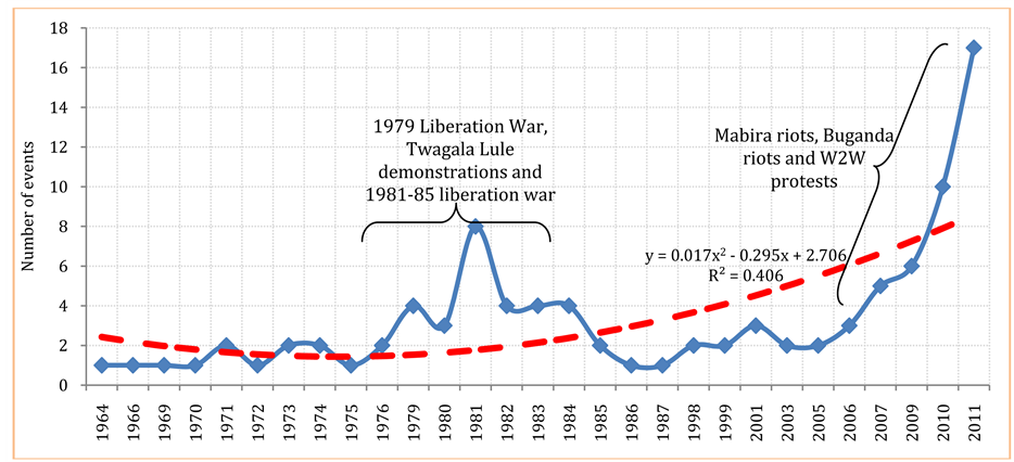 Figure 1 shows the number of urban social disorder movements in Kampala City since 1964. The figure