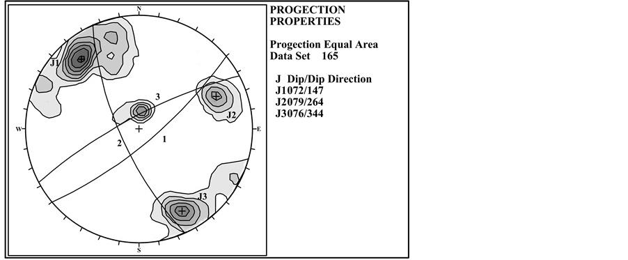 Different locations in Mishan formation around the main axis have been considered for field studies. 0 discontinuities on the left and 85 discontinuities on the right abutments were measured and the results were represented in Contour diagram. There are three joint sets in the study area, both of them (J1 and J3) are the main large fractures around the Chamshir dam. These fractures indeed consist with the normal faults in NE-SW direction. The third joint set in NW-SE is normal to the others (Figure 7).