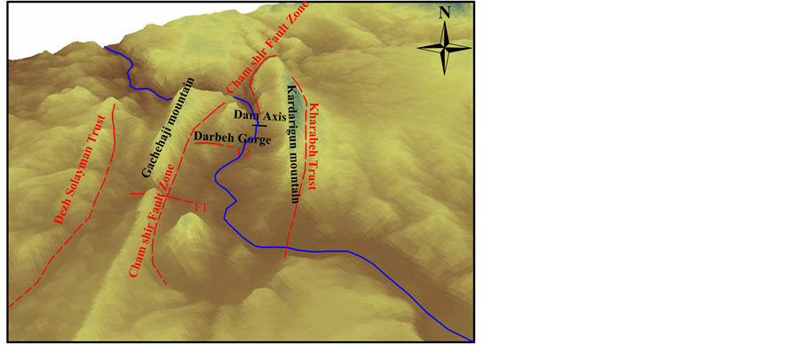 Dezh solayman and Kharabeh trusts with NE dip direction, are the main faults around the Chamshir syncline that are located in the SW and NE climbs of the syncline respectively. The role of the Dezh solayman in the study area is important according to field observation. The Gachsaran formation is uplifted along this fault from deeper parts to the surface. It has dissected some parts of the Mishan formation in the north-eastern branch of the Chamshir syncline and has consequently thrust the Gachsaran formation over the Mishan formation. The extensive tectonic pressure of the Dezh solayman created the important Chamshir fault area, this being the source of several springs throughout this area and the Dezh solayman. The Zuhreh rivers deviation from its direct pathway into the Chamshir fault area could also provide reasonable evidence of tectonic activity in the study area [4] .