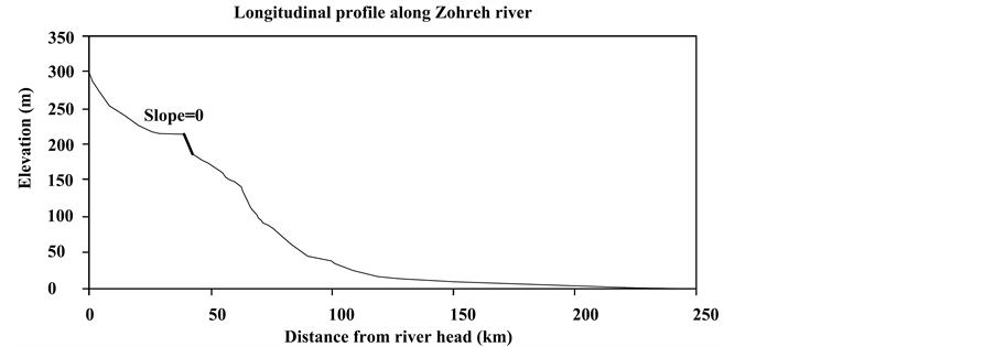 Figure 9. Longitudinal profile of Zohreh River derived from DEM, represented the slope value in Dam site and knickpoint location along river just after dam.