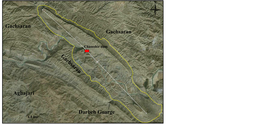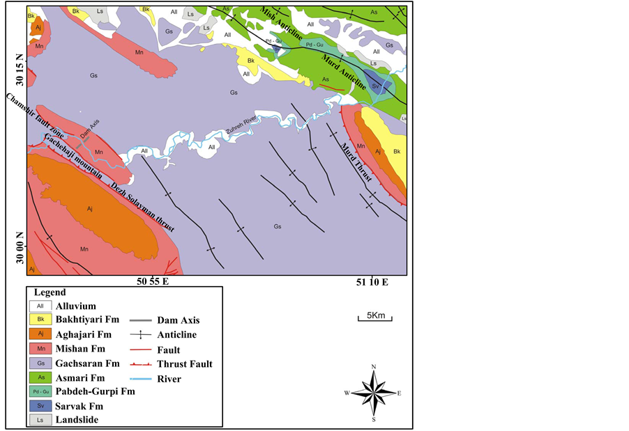 The Chamshir dam site on the Zuhreh River is located in south-western Iran, about 20 km southeast of the Gachsaran city. The Zohreh River is one of the most important rivers in south of Iran. Its length is 490 km and its height from the source is 2850 m. After flowing through the township of Behbahan, it joins the Persian Gulf. The geological formations in the study area, from oldest to youngest, are Gachsaran, Mishan, Aghajari, Bakhtiari and alluvial sediments. The Mishan formation along with the Gachsaran formation cover the western part of the dam reservoir and dam site [3] [4] . The Zuhreh River has created the long and narrow Chamshir gorge by erosion of biohermy limestone, thereby making it a suitable location for dam construction. The main lithology of the area consists of limestone and marl rocks of Mishan formation (Figure 1). The study area is in the Zagros folded area or external Zagros [5] and simply folded belt. Zagros folding compressional tectonic forces have created some faults and thrust faults having a NW-SE trend in the study area; the Dezh solayman thrust, Murd thrust and Chamshir fault area are the most important ones. Seismologically, it’s located in the Zagros zone and has a similar behavior [4] .
