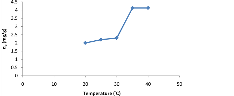 Temperature of the process is also an important factor influencing the biological adsorption of metal ions [13] . Experiments of cerium adsorption were studied at 20˚C, 25˚C, 30˚C, 35˚C and 40˚C. It was found that the temperature in the range 20˚C to 35˚C has no effect on the biosorption and the cerium adsorption is influenced by temperature at 35˚C to 40˚C (Figure 4).