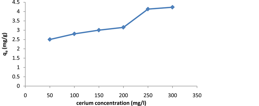 Biosorption of cerium was studied as a function of metal concentration in the range of 50 to 300 mg/L. The amount of cerium adsorbed onto activated carbon increases with increasing initial concentration of metal ions. For element of cerium, when the ion concentration increases, the equilibrium loading of metal ion significantly increases and there is often saturation at higher concentrations (Figure 6).