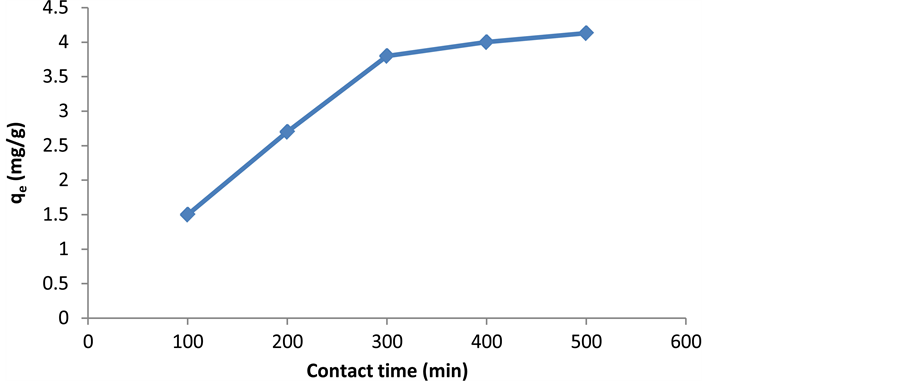 As shown in Figure 7, the capacity of cerium adsorption is high in the first 300 minutes and increases with increasing contact to 500 minutes. After that, there is no significant increase in cerium adsorption. So, this time of interaction can be considered as equilibrium time of reaction. Rapid adsorption in the initial stages is probably due to the increase in the concentration gradient between the adsorbed material in the solution and adsorbent. As long as the phenomenon of adsorption desires to achieve a stable equilibrium, the initial rapid loading of metal ion will be in the form of physical adsorption. When the contact time increases, many operating groups will par-