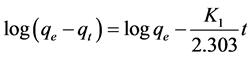 Pseudo-first-order equation was proposed by Lagergren in 1898 for the adsorption kinetics of the liquid on the solid phase. This model is in line with the adsorption rate based on absorption capacity and is expressed as follows [25] [28] [29] :