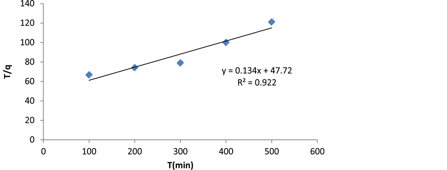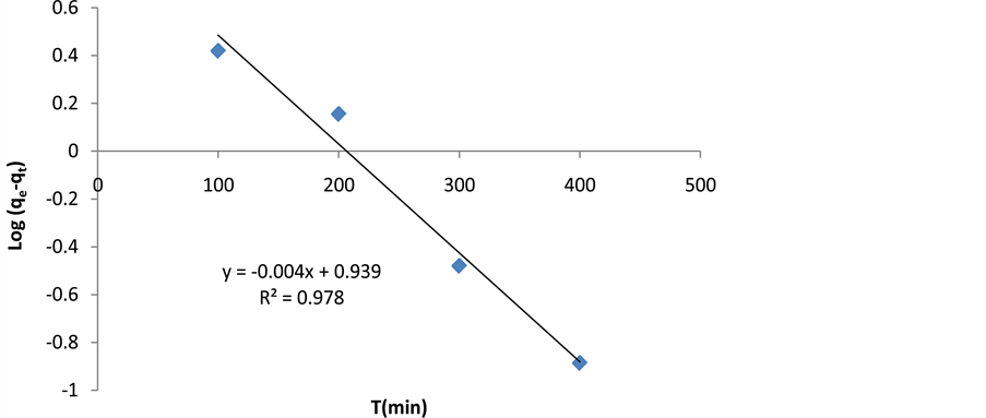 In order to understand the dynamics of adsorption reactions, data on adsorption kinetics were examined.As was observed cerium adsorption increases with increasing time and reaches equilibrium during 300 minutes (Figure 7). The equilibrium time and cerium adsorption depends on the initial concentration of the adsorbed material. In the first stage, adsorption is fast and it gradually declines in the second stage; in other words, the phenomenon of adsorption is under control. The final stage is final equilibrium. There are several mathematical models to describe the reaction kinetics [27] . In this study, we investigated pseudo-first-order model (Lagergren), pseudo-second-order model (Ho et al.), intraparticle diffusion kinetic model and Elovich kinetic model.