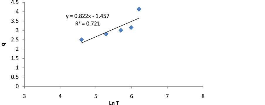 where B is Temkin constant related to adsorption heat (B = RT/b) and A is constant of equilibrium bond (L/g) which is corresponding to maximum binding energy [25] [26] . Temkinisotherm constants can be achieved by drawing changes of q to lnCe (Figure 10 and Table 1).