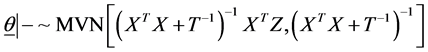 In Formula (7), fully conditional posterior distribution of vector of model parameters is multivariate normal distribution (MVN) with mean vector and variance covariance matrix as specified where