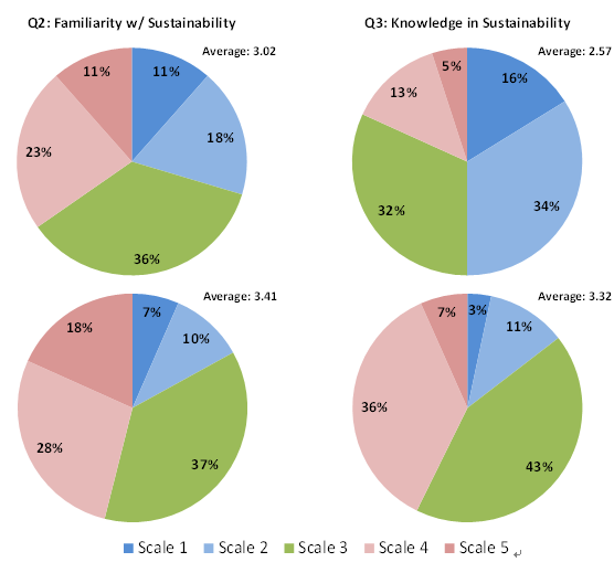 1. Although many college students think they know about and are familiar with the concept of sustainability, they are not fully confident in their level of knowledge in this area. This result may be attributed to a lack of formal education on sustainability.