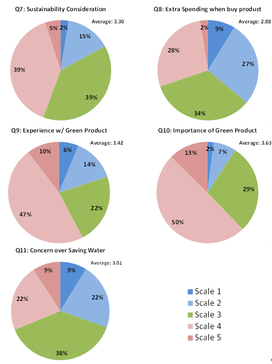 The third section under Part II consisted of five questions exploring the green product purchase behavior of students. For Question #7, the average score of 3.30 shows that the students do tend to consider sustainability when they purchase products. However, the responses to Question #8 suggest that they would be unlikely to spend extra money to purchase green products based on the average score of 2.88 for this question. This attitude-behavior dilemma reflects the findings from previous studies [1] - [3] described earlier. For Question #9, more than half of the respondents (57.7%) reported some experience with using energy-saving products. Consistent with this response, the result for Question #10 was also positive with regard to the level of importance they assigned to green products. The averages for Questions #9 and #10 were 3.42 and 3.63 respectively, indicating the respondents’ generally positive attitude towards green products. Question #11 asked about the students’ perceptions concerning the need to save water. The results here again reinforced the attitude-behavior gap issue; the somewhat mediocre average score of 3.01 for this question suggests that when the students used water in the course of their daily activities (e.g., for showering, washing, and so on), they experienced some conflict between the competing priorities of using enough water for self-satisfaction and saving water for sustainability.