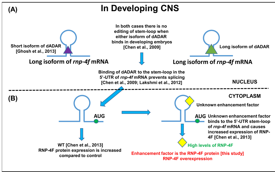 Figure 5. Model for rnp-4f gene expression regulation. (A) In the developing central nervous system (CNS), a dADAR isoform binds to the long rnp-4f stem-loop in the 5’-UTR regulatory region [6] [7] [9] . This interferes with splicing of the intron, perhaps by using a steric hindrance mechanism, after which the longer rnp-4f mRNA isoform exits the nucleus. (B) In the cytoplasm of developing CNS cells, the retained stem-loop recruits RNP-4F protein, which unwinds the structure and results in efficient small ribosomal subunit scanning to locate the AUG start codon, enhancing RNP-4F translation via a feedback pathway.