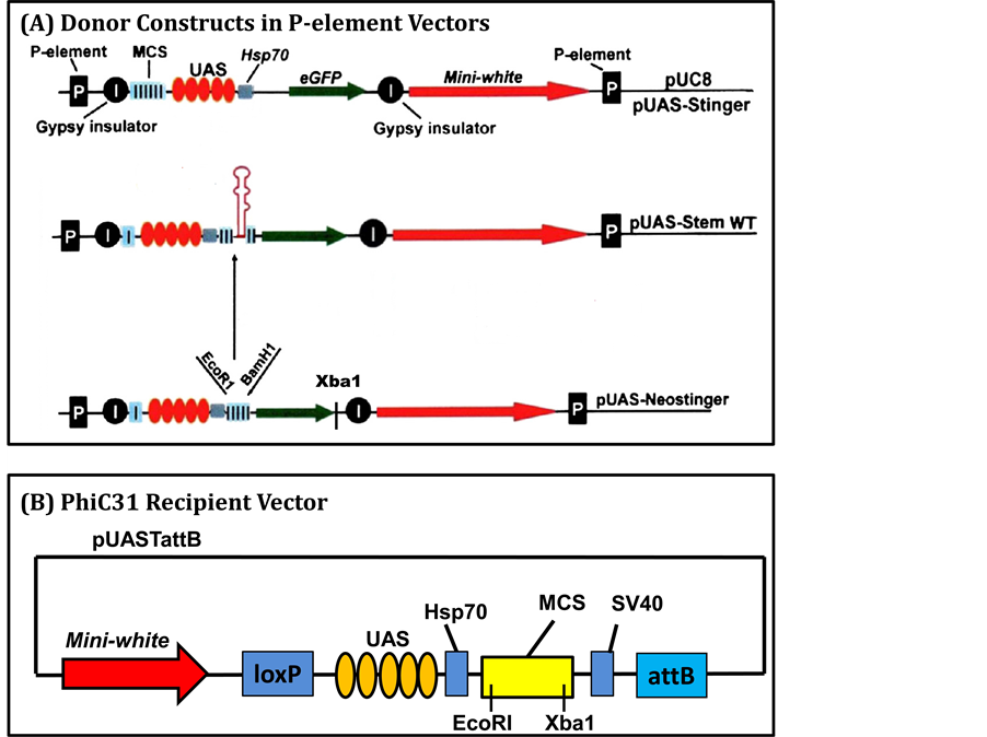 Figure 1. Source plasmids. (A) pUAS-Neostinger and pUAS-Stem WT were two of the source plasmids used for construction of the transforming vectors [8] . A commercially synthesized scrambled sequence (random sequence but same length as the 177-nt stem-loop in wild-type) containing EcoRI and BamHI adapters was PCR-amplified, restricted and then ligated into the pUAS-Neostinger plasmid within the multiple cloning site (MCS). (B) pUASTattB was the third source plasmid used for constructing the transforming vectors [23] . This plasmid is provided with a mini-white gene for selection of red eye transformed flies, UAS, Hsp70 promoter and a SV40 region to enhance genomic integration of transforming DNA constructs.