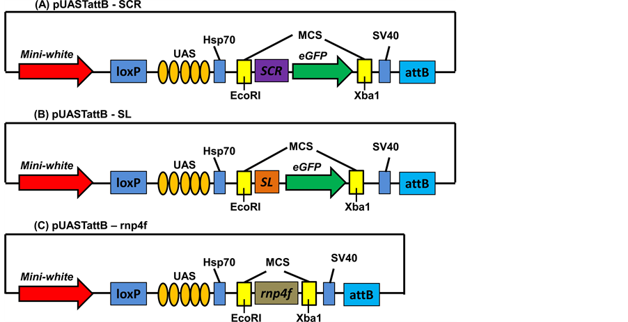 structs. In an attempt to bypass these problems we opted to use the ΦC31 transforming vector, pUASTattB, which because of its endogenous integrase and precise integration makes the transformation more efficient and optimal for in vivo functional studies [23] . Two of the plasmids were constructed with a downstream reporter eGFP which is an enhanced GFP coding sequence with a nuclear localization signal to optimize the GFP expression and visualization process. The transformed flies could be easily selected based on their red eye phenotype because of the mini-white gene present in the transforming vector, pUASTattB. The construction process resulted in three plasmid vectors: pUASTattB-SCR, pUASTattB-SL and pUASTattB-rnp-4f (Figure 2).