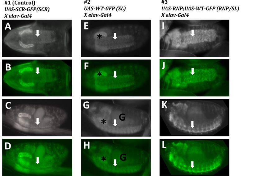 Figure 4. GFP reporter gene expression in Drosophila embryos. Fluorescence micrographs of GFP reporter gene protein expression in stage 14 - 16 embryos showed that in control embryos (column #1, (A)-(D)), UAS-SCR-GFP crossed with elav-Gal4, there is weak fluorescence in the gut and CNS, in the presence of the stem-loop upstream of the GFP reporter. In column #2 ((E)-(H)), UAS-WT-GFP crossed with elav-Gal4, the GFP fluorescence in the developing CNS is enhanced compared to the control. In column #3 ((I)-(L)), in the presence of the stem-loop upstream of the GFP reporter and excess RNP-4F in embryos, GFP fluorescence in the developing CNS is further enhanced. Individual images are printed in color and also black/white, for greater clarity in visualization. Figures in the two upper panels of each column show dorsal views and those in the two lower panels of each column show lateral views with ventral side facing down. Anterior is to the left in all panels. Arrows show ventral nerve cord and G is gut. Asterisks mark salivary glands.