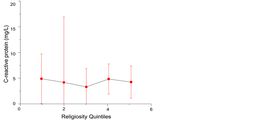 Figure 1. C-reactive protein (median, interquartile range) by overall religiosity (ρ = 0.0004, p = ns, n = 129).