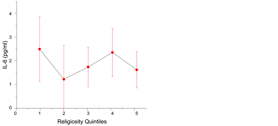 Figure 2. Interleukin-6 (median, interquartile range) by overall religiosity (ρ = −0.015, p = ns, n = 126).