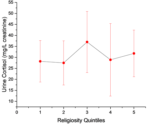 Figure 3. Urine cortisol (median, interquartile range) by overall religiosity (ρ = 0.054, p = ns, n = 127).