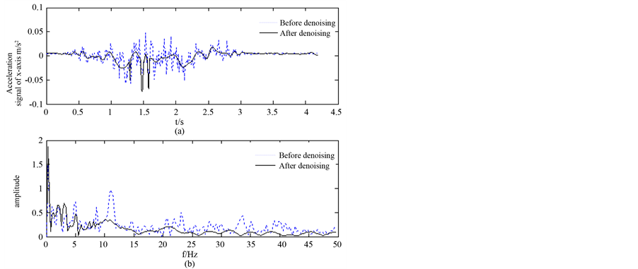 Figure 5. Waveform and frequency spectrum of X axis acceleration signal before and after denoising.