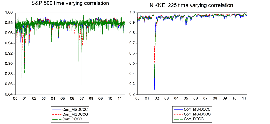 8The range of fluctuation in the time-varying correlation for S&P 500 is (0.8581, 0.9957) for the range-based DCC, (0.8964, 0.9909) for the return-based MS-DCC, and (0.8947, 0.9932) for the range-based MS-DCC. However, the range of fluctuation in the time-varying correlation for NIKKEI 225 is (0.3597, 0.9915) for the range-based DCC, (0.5083, 0.9910) for the return-based MS-DCC, and (0.2413, 0.9932) for the range-based MS-DCC.