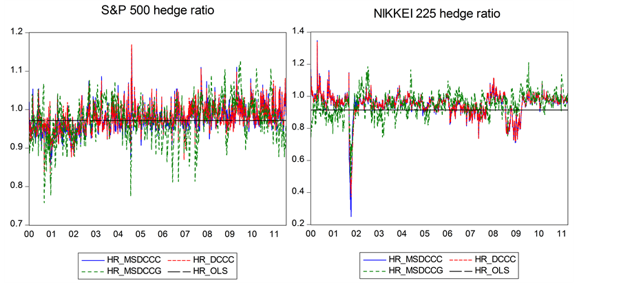 Figure 3. The constant OLS, return-based MS-DCC, range-based DCC and MS-DCC hedge ratios for S&P 500 and NIKKEI 225 (2000.1.3-2011.6.29). This figure plots four hedge ratios estimated from constant OLS (HR_OLS), return-based MS-DCC (HR_MSDCCG), range-based DCC (HR_DCCC) and MS-DCC (HR_ MSDCCC) models.
