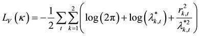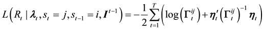 The log likelihood function of the MS-DCC model is presented in this section. According to Engle [1] and Chou et al. [12] , the two-step quasi-maximum likelihood approach is suitable for estimating the models in the DCC family. It is natural to execute the first step quasi-maximum likelihood estimation (QMLE) using Equation (2), as our specification allows only the conditional correlation to change in different regimes. The likelihood function of the volatility component,