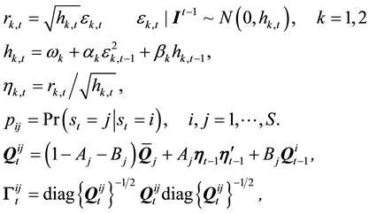 5) Return-based MS-DCC: A more flexible return-based dynamic conditional correlation model proposed by Pelletier [17] and Billio and Caporin [18] , which can be expressed as: