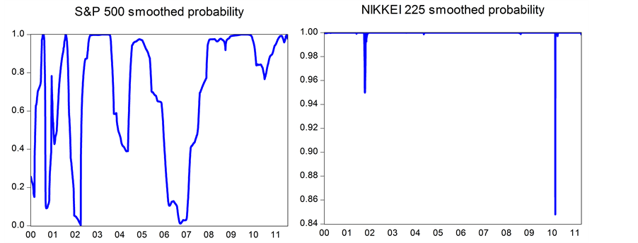 Figure 1. The smoothed probability of low correlation regime for S&P 500 and NIKKEI 225 (2000.1.3 - 2011.6.29). This figure plots the smoothed probability estimated by range-based Markov-switching dynamic conditional correlation model.