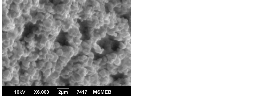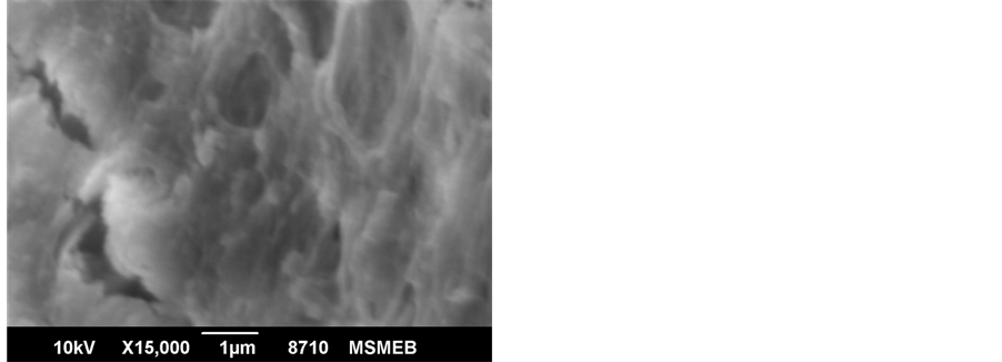 Figure 1(a) and Figure 1(b) show the scanning electron microscopy (SEM) analysis of untreated fibre and treated ones’ fired at 1000˚C. One can notice from the above figures that there is change in the morphology of coir fibre before and after treatment. Uneven and cracked surface can be seen in the untreated samples which may be due to the presence of impurities in the fibre. The intercellular gaps which are seen in the untreated fibre were found to be less and there was change in the unevenness of the surface in contrast of treated fibre, it may be due to the chemical treatment done on the fibre. The variation in the surface of fibre is found due to chemical treatments and comparable behavior has been reported by some other researchers in their work [18] [19] . One finds that there is removal of surface impurities by chemical treatment which makes the fiber rough and that there was an increase in the surface area of fibre than that of raw fibre [20] .