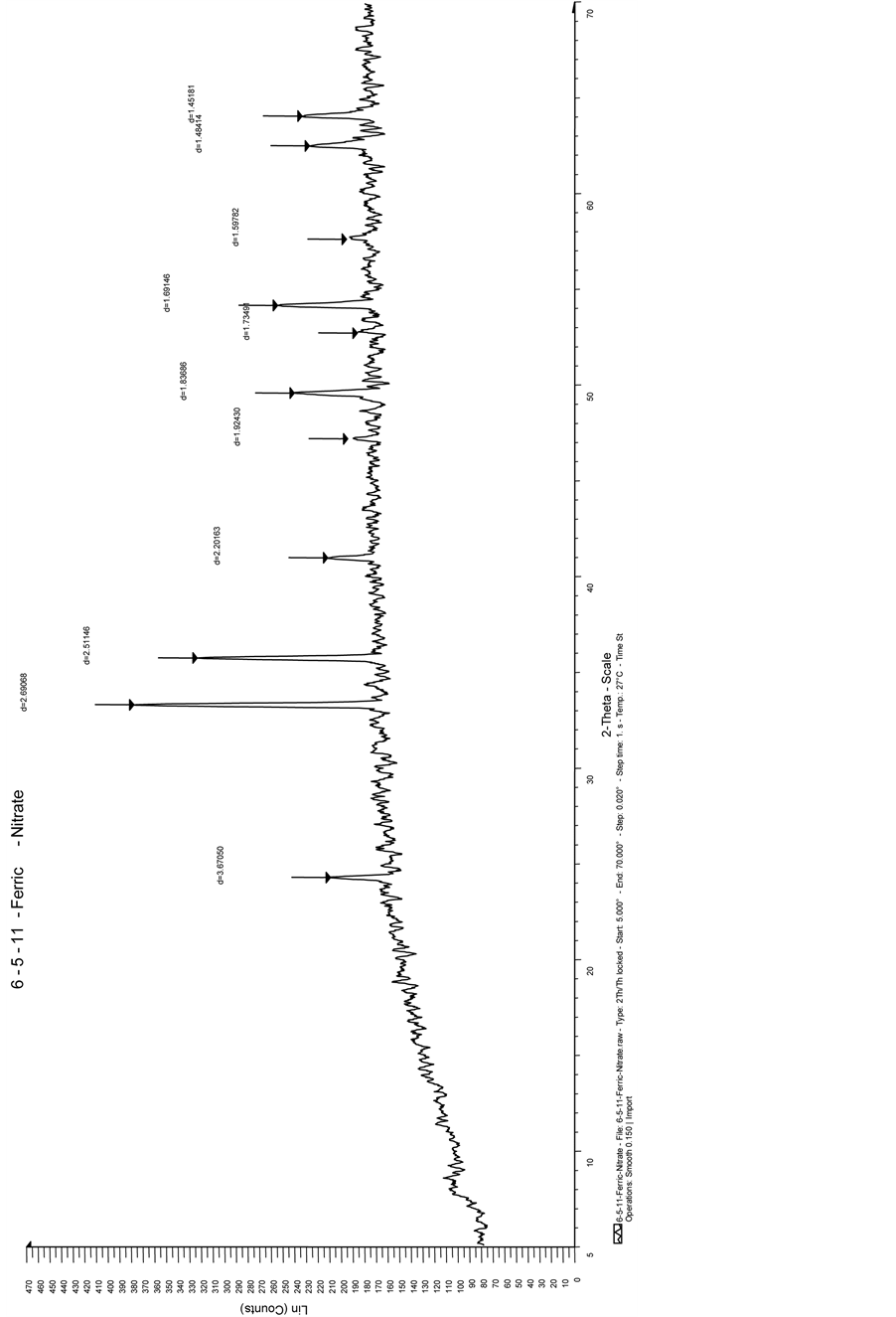 When ferric nitrate reacts with ammonium chloride and ammonium hydroxide along with coir fiber at 1000˚C ferric oxide is formed which is confirmed through XRD analysis and other byproducts like 6NH4NO3 ammonium nitrate and HOCl (hypoclorous acid) decomposed at such high temperature and only ferric oxide is left.