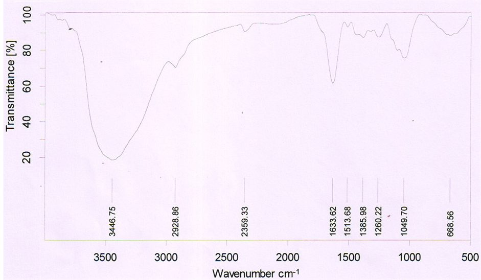 From the FTIR analysis (Figure 3) the 3446 cm−1 broad intense absorption valley (low transmittance) in raw coir fibre is due to the O-H stretching for hydrogen-bonded hydroxyl group present in polysaccharide. It also indicates the broad & strong band from cellulose, hemicelluloses and lignin of coir fibre. The weak peak occurs at 1386 cm−1 in raw coir fibre is due to the presence of hemicelluloses that can be assigned to the group of C=O stretching. However the broad intense absorption at 1049 cm−1 is that of (C-OH). The absorption at 2928 cm−1 refers to Alkyl C-H group. The absorption at 2359 cm−1 refers to water. The absorption at 1633 cm−1 in raw coir is due to the C=C aromatic skeletal ring vibration due to lignin [24] - [26] .