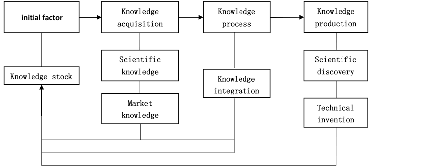 The process of products production is the whole process which includes steps from input of raw materials to the formation of finished products [7] . Acquisition and processing of the raw materials, as well as finishing products are the main representative stages among these steps [8] . The raw materials are knowledge, the knowledge to be processed is scattered, and the finished part is new knowledge produced by universities during production process of new knowledge. So we divide the process of knowledge production into three stages, including knowledge acquisition, knowledge process and knowledge formation [9] . As one of the main subjects in knowledge production of innovation clusters, universities essentially have scientific research talents who are skilled at creation of knowledge and rich knowledge resources carried by the talents. Hence the knowledge stock that universities have already is the initial factor of knowledge production which affects the level of new knowledge production. The stages including Knowledge acquisition, knowledge process and knowledge formation afterward are progressive gradually one by one. The previous stage affects the next stage. At the same time, knowledge accumulated in every step of knowledge production process increases the knowledge stock in universities, as shown in Figure 1.
