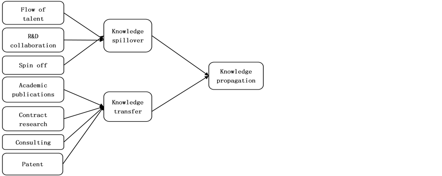 Because knowledge spillover is an unconscious process, its main form is university- industry communication aimed at tacit knowledge which is difficult to code. It includes flow of talent, R & D collaboration and spin-off. Universities’ function of talent training ensure its rich human resources and talents have plenty of tacit knowledge accumulated in the environment of universities. So talents could become medium that let knowledge flow from universities to companies through talents flow in different space and make connections with the environment around them. R & D collaboration is a kind of partnership between universities and industry because of knowledge complementarity of them, especially university-industry strategic alliance based on long-term and stable cooperation. During R & D collaboration, researchers from universities and technical persons from firms exchange their knowledge by informal contacts and attending academic conferences so that to realize knowledge spillover of universities. Spin-offs are science and technology enterprises which come into being from universities, are based on scientific research achievements, and are founded by college teachers and researchers [15] . Entrepreneurs of universities are from colleges and have innumerable links with universities. During the process of startup, they communicate and cooperate constantly with organizations outside universities. And other companies in clusters will learn from spin-offs on account of their advantages in knowledge. So Spin-off becomes another way for knowledge spill over.