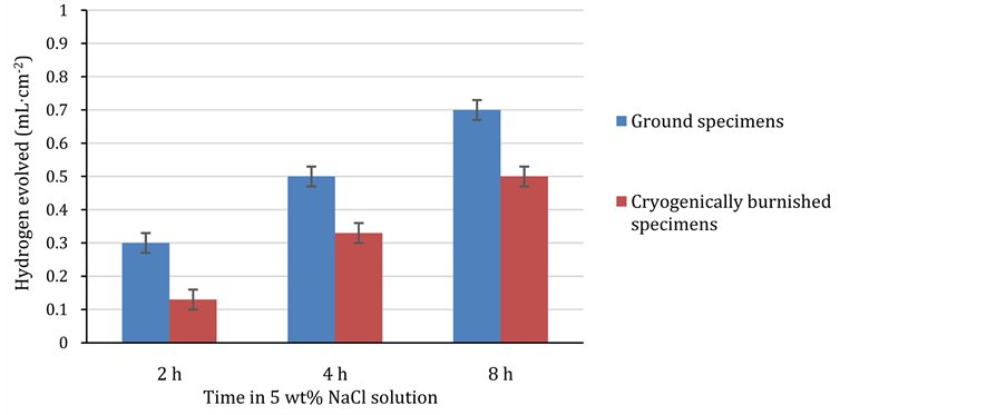 Figure 4. Comparison of hydrogen evolution obtained using ground and cryogenically burnished and ground specimens (Constructed from results given by Pu et al. [70] ).