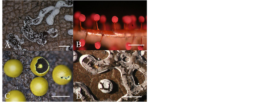 Figure 4. Myxomycete fruiting bodies of four species, of which relative abundance showed a correlation between litter pH in Table 4. (A) Physarum cinereum; (B) Physarum roseum; (C) Diderma simplex; (D) Diderma effusum. Bars: 1 mm.