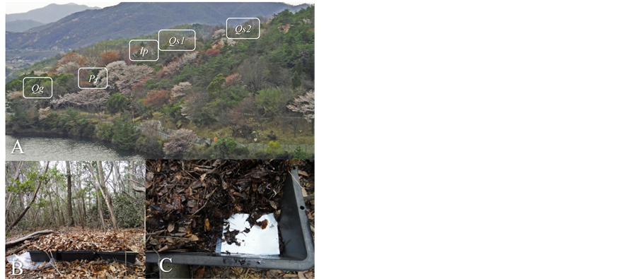 The study sites were located in the Himeji Nature Sanctuary, which covers 59 ha of a typical mixed secondary forest in Oichinaka, Himeji City, Hyogo Prefecture (34˚51.33'N, 134˚37.18'E), along an altitudinal gradient from 60 to 196 m above sea level. The forest crown reached approximately 18 m in height and mainly consisted of deciduous Quercus serrata Murray mixed with Prunus jamasakura Sieb. et Koisz. trees, evergreen Quercus glauca Thunb., and Ilex pedunculosa Miq. trees, and sparsely distributed coniferous Pinus densiflora Sieb. & Zucc. trees (Figure 1(A)). The sub-canopy and shrub layers were dominated by Q. serrata and Clethra barbinervis Sieb. et Zucc. interspersed with Eurya japonica Thunb. and young Q. glauca. Five investigation sites were