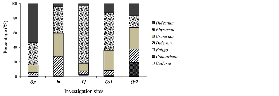 Figure 2. Genus composition (%) of myxomycete at the five investigation sites of Qg (dominant tree species of Quercus glauca), Pj (dominant tree species of Prunus jamasakura), Ip (dominant tree species of Ilex pedunculosa), Qs (dominant tree species of Quercus serrata).