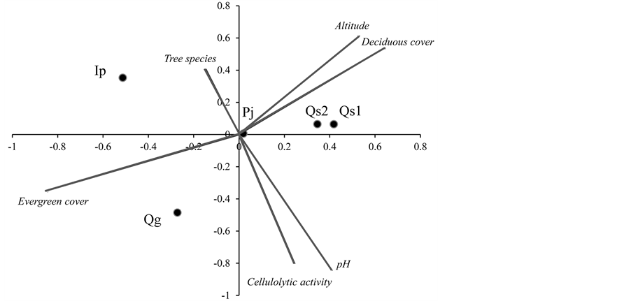 Figure 3. NMDS ordination diagram of myxomycete assemblage distribution on five different leaf litters in a mixed forest. Lines indicate the direction and strength of the important microenvironmental variables. The r2 values of the first and second axes were 0.598 and 0.392, respectively. The first axis is primarily correlated with deciduous cover (r = 0.644), evergreen cover (r = −0.845), altitude (r = 0.525), number of tree species (r = 0.147), pH (r = 0.406), and decomposition rate (r = 0.241). The second axis had a significant Spearman’s correlation with litter pH (ρ = −0.900, p < 0.05), decomposition rate (ρ = −0.700), altitudinal location (ρ = 0.700), deciduous cover (ρ = 0.000), evergreen cover (ρ = −0.564), and number of tree species (ρ = 0.154). Qg, Quercus glauca; Pj, Prunus jamasakura; Ip, Ilex pedunculosa; Qs, Quercus serrata.
