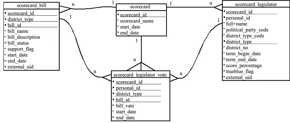 ・ Finally scorecard_legislator_vote is used to store the legislators’ votes on a specific bill_id in a specific congressional session.