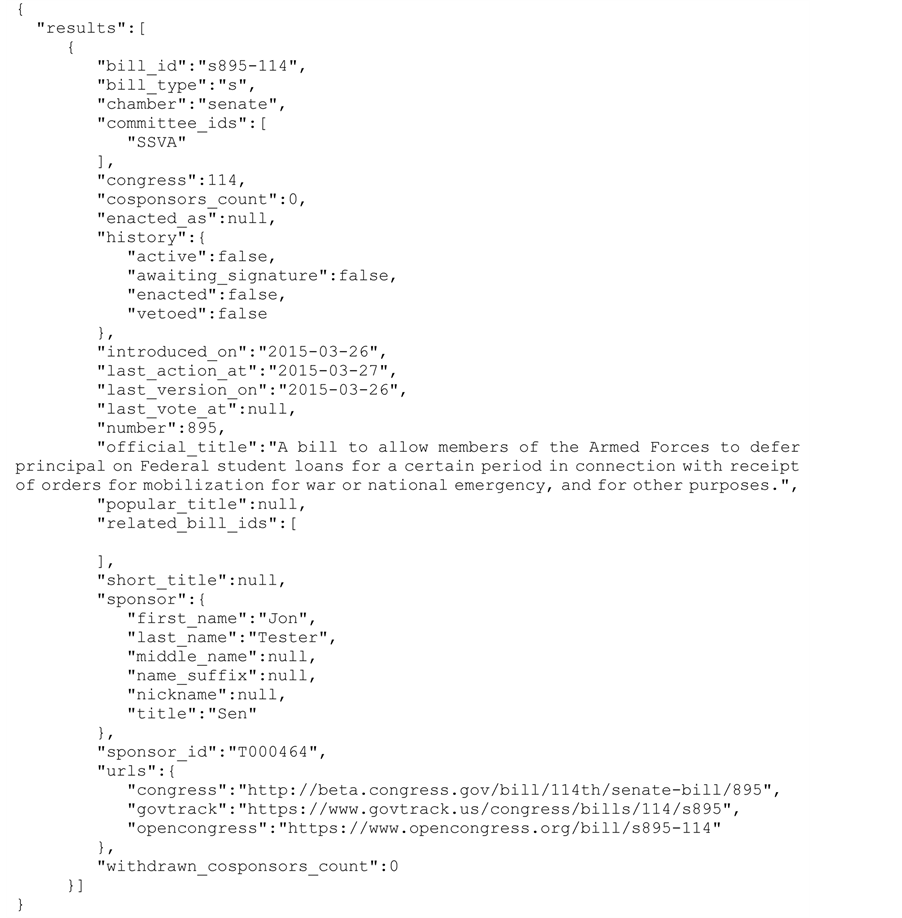The data can be retrieved from the API in either JSON or XML format. The web server used for YeaNay (ColdFusion MX7) does not have methods to parse JSON (native format of the external API) data and therefore receives the data in XML format. The database has JSON functions and therefore, requests made by the database receive and parse the data in JSON. Each of the available methods returns a large amount of data, not all of which is used. For example, /bills by default returns a large quantity of information that is largely unnecessary when developing a voter guide (Figure 3). For YeaNay, only specific fields were requested when making the calls to the various methods (Table 1).