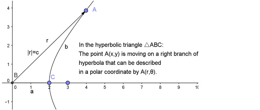 Figure 2. A point A ( x , y ) is moving on a right branch of a unit hyperbola x 2 y 2 = 1 , with a hyperbolic triangle ABC.